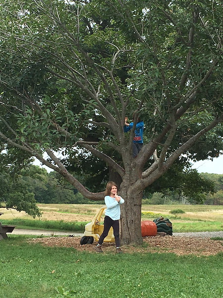 Our wagon ride ended at the farm store where the kids climbed trees next to a beautiful field of sunflowers. It's a rare outing for our family that doesn't include at least an hour of climbing!