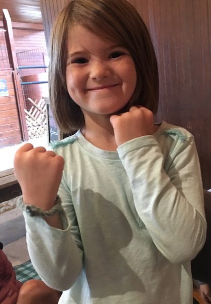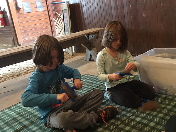 One of the instructors took the kids to visit the henhouse and collect eggs. Then she showed them how to card their own wool and spin it into yarn. Abigail enjoyed making a yarn bracelet.