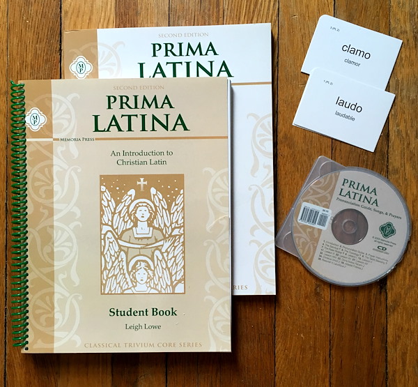 The Prima Latina (Complete Set) is designed for grades one through four, but I found it easily adaptable for use with my kindergartener and second grader. The set includes a teacher's manual, a consumable student workbook, a full set of flashcards covering all vocabulary, conjugations, and declensions, an audio CD for pronunciation practice, and a set of three DVDs containing 9 hours of instruction presented by the author, Leigh Lowe.